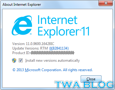 IE11 for Windows 7 มีหมายเลขเวอร์ชันเป็น Version: 11.0.9600.16428IC, Update Versions: RTM (KB2841134) ดังภาพด้านล่าง